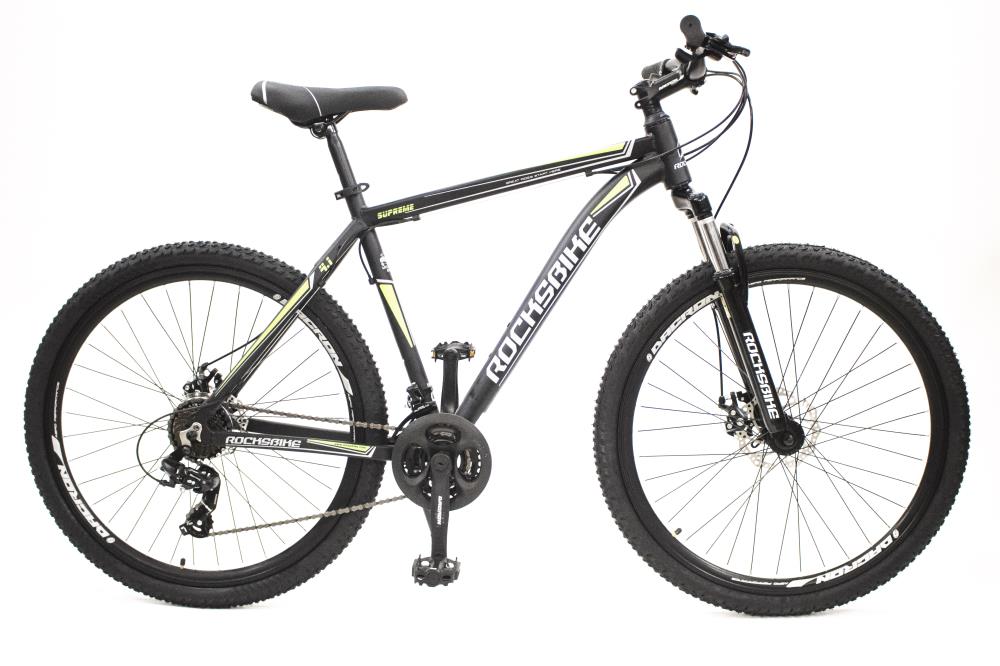 Rocksbike Supreme 4.1 | Adults | MTB | Wheel size 27.5″ | Number of speeds 24 | Frame Alloy | Bicycle seat Dacron XML 38.1 | Brakes Mechanical disc brakes | Front gears 3 | Rear gears 8 | Rear derailleur Shimano RD-TY300 Tourney | Black / Yellow | Weight 15.6 kg