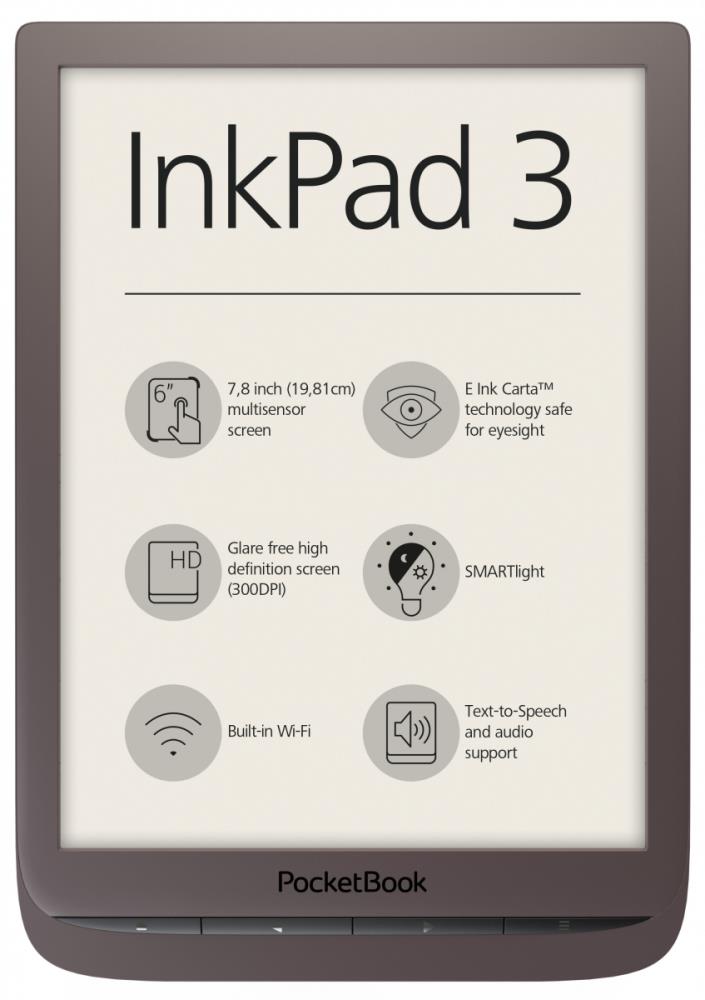 E-Reader|POCKETBOOK|InkPad 3|7.8″|1872×1404|Memory 8192 MB|1xAudio-Out|1xMicro-USB|Micro SD|Wireless LAN 802.11b/g/n|Dark Brown|PB740-X-WW
